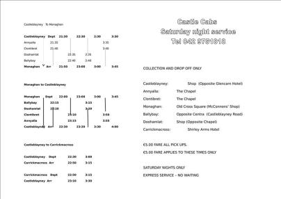 Castle Cabs are now offering a €5 taxi service from Castleblayney and running through a number of villages en route to Carrickmacross and Monaghan town on Saturday nights.